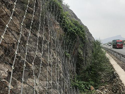 主動防護網(wǎng)是以鋼絲繩網(wǎng)為主的各類柔性網(wǎng)覆蓋包裹在所需防護斜坡或巖石上,限制坡面巖石土體的風(fēng)化剝落或破壞以及危巖崩塌,將落石控制于一定運動范圍內(nèi)以保護行人和車輛安全通過的防護工具。